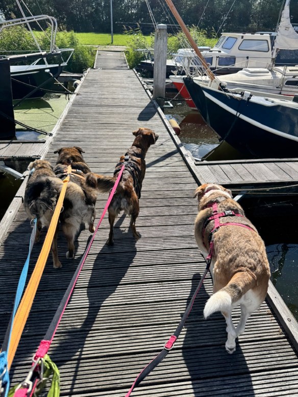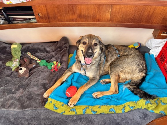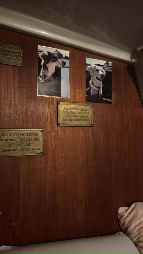 Für Taylor und Cindy war es „nach Hause kommen“, sie waren schon oft genug mit ihr unterwegs. Fiene kannte nur die GROßE und war zu Beginn etwas verwirrt… Für Maja ist das Boot eine große Hundehütte als Abenteuerspielplatz.